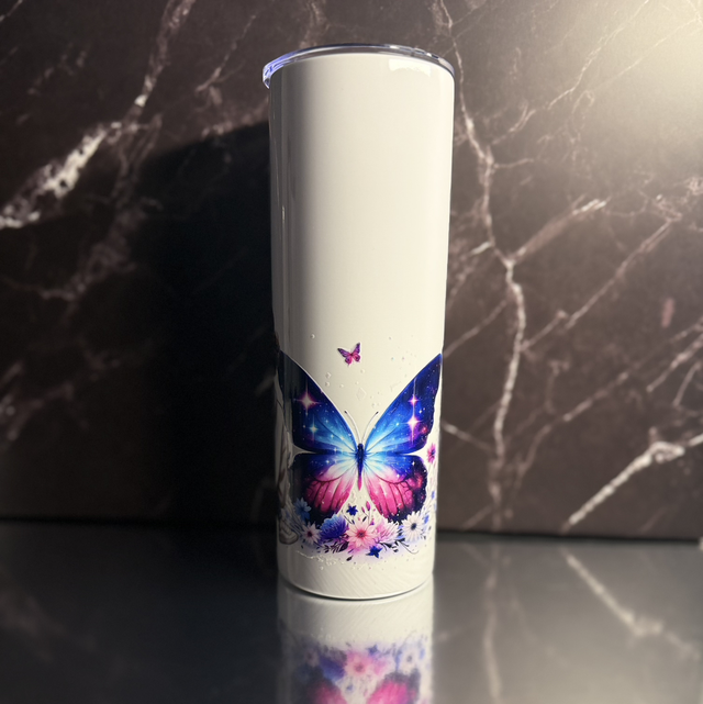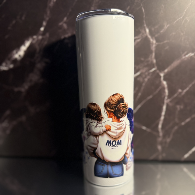 Das liebevoll gestaltete Motiv „Mama mit Kind“, umgeben von blau-lila Schmetterlingen, Blumen und funkelnden Sternen, macht diesen Becher zu einem echten Herzensstück – perfekt als Geschenk oder für dich selbst.